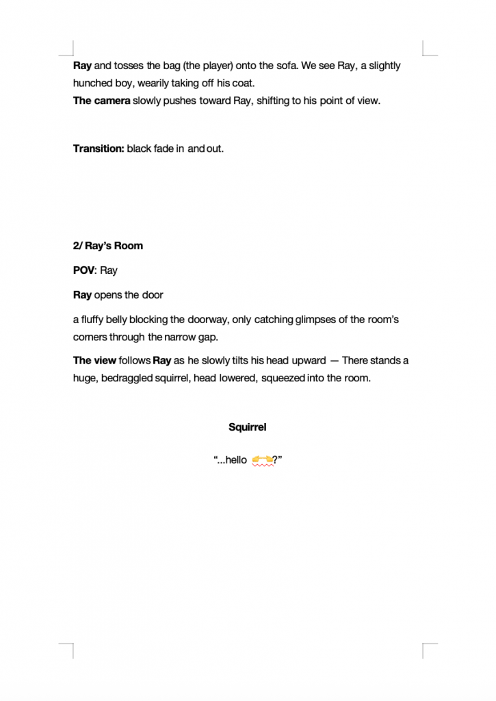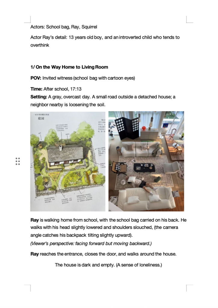 Embodiment also encouraged us to rethink character perspective. Rather than explicitly assigning a role, physical positioning and agency can imply identity. Being placed at the edge of a space, limited to observation, can convey exclusion or lack of agency, while being positioned at the centre and addressed directly can create a sense of responsibility and expectation.
